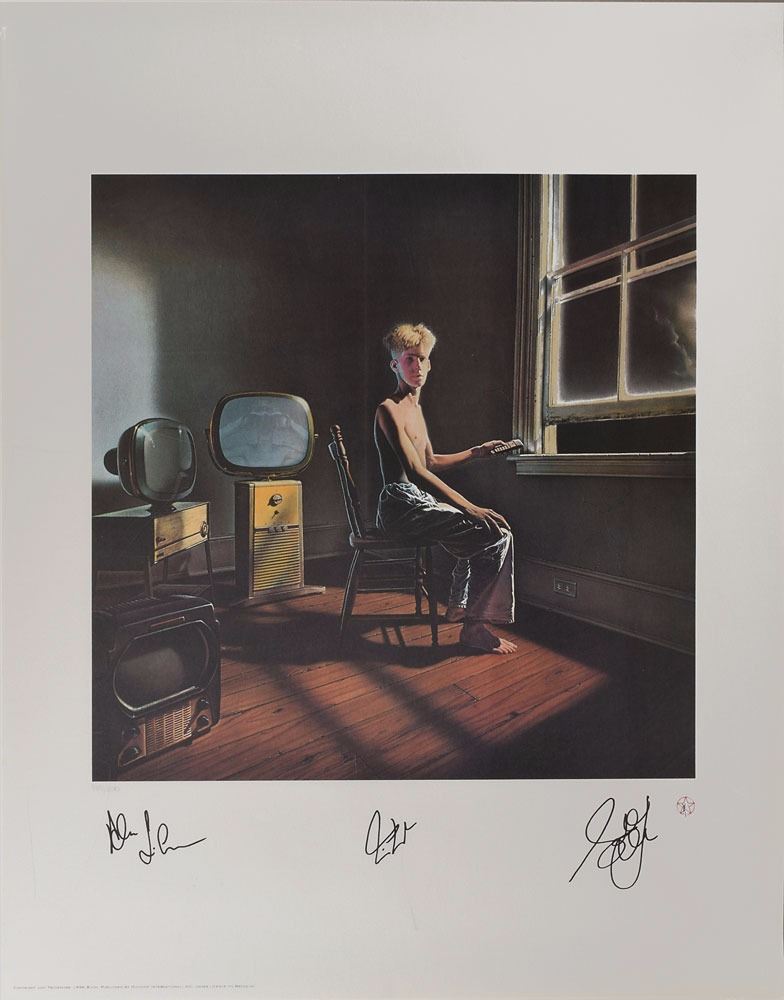 Color limited edition 22 x 28 lithograph of the Power Windows album cover, numbered 454/500, signed in the lower border in black felt tip by Geddy Lee, Alex Lifeson, and Neil Peart. Rolled and in fine condition, with a light mark to the lower border.