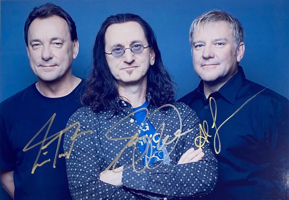 Rush band facsimile facsimile signed photo autographed by Neil Peart, Geddy Lee and Alex Lifeson. 8x10 inches. This item is a reprint of an original autograph