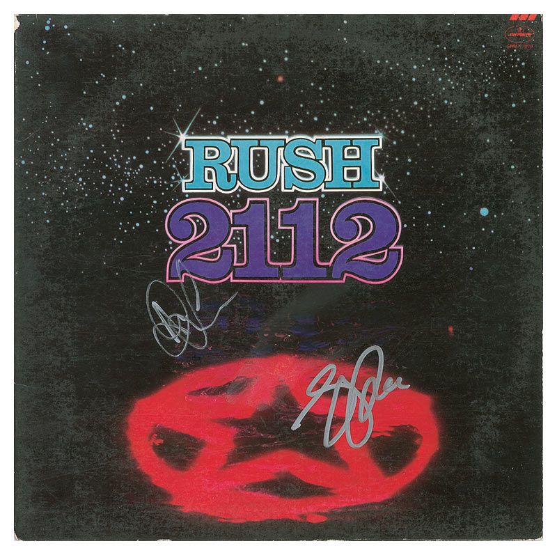 2112 album signed on the front cover in silver ink by Geddy Lee and Alex Lifeson. In fine condition, with light ‘ring of wear’ to front cover. The record is included.