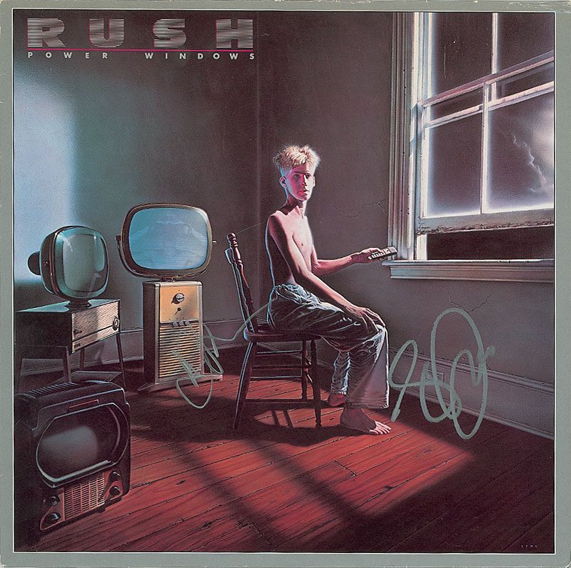 Power Windows album signed on the front cover in silver ink by Geddy Lee and Alex Lifeson. Scattered light edge creases, a couple slight edge separations, and a price label affixed to back cover, otherwise fine condition. The record is included.