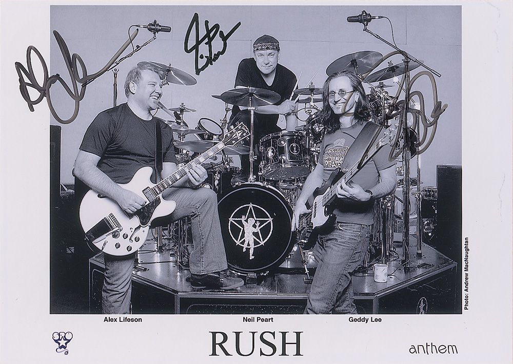 Glossy 7 x 5 Anthem promotional group photo, signed in black felt tip by Geddy Lee, Neil Peart, and Alex Lifeson. In fine condition.
