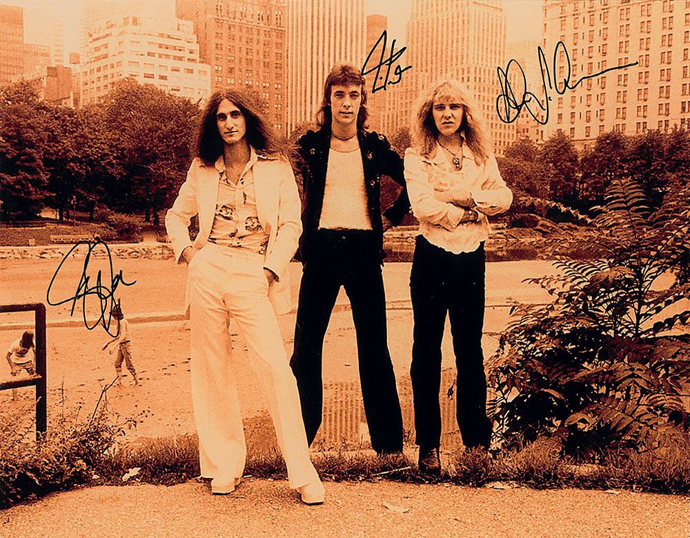 Satin-finish 14 x 11 group photo, signed in black felt tip by Geddy Lee, Neil Peart, and Alex Lifeson. In fine condition, with a slightly grainy quality to the image.
