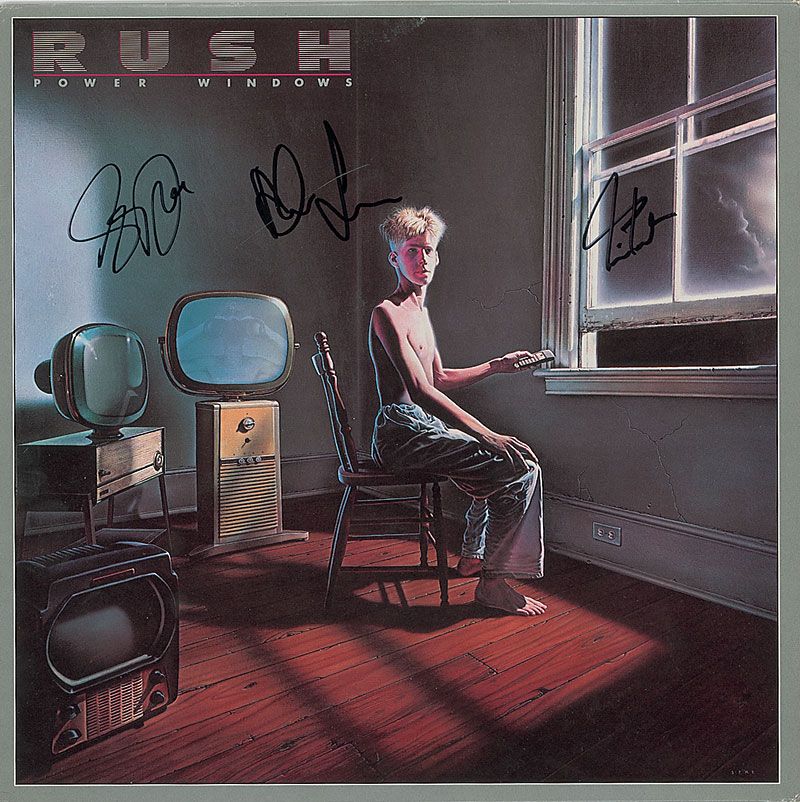 Power Windows album signed on the front cover in black felt tip by Geddy Lee, Neil Peart, and Alex Lifeson. In fine condition. The record is included.