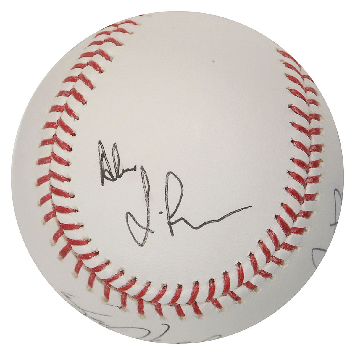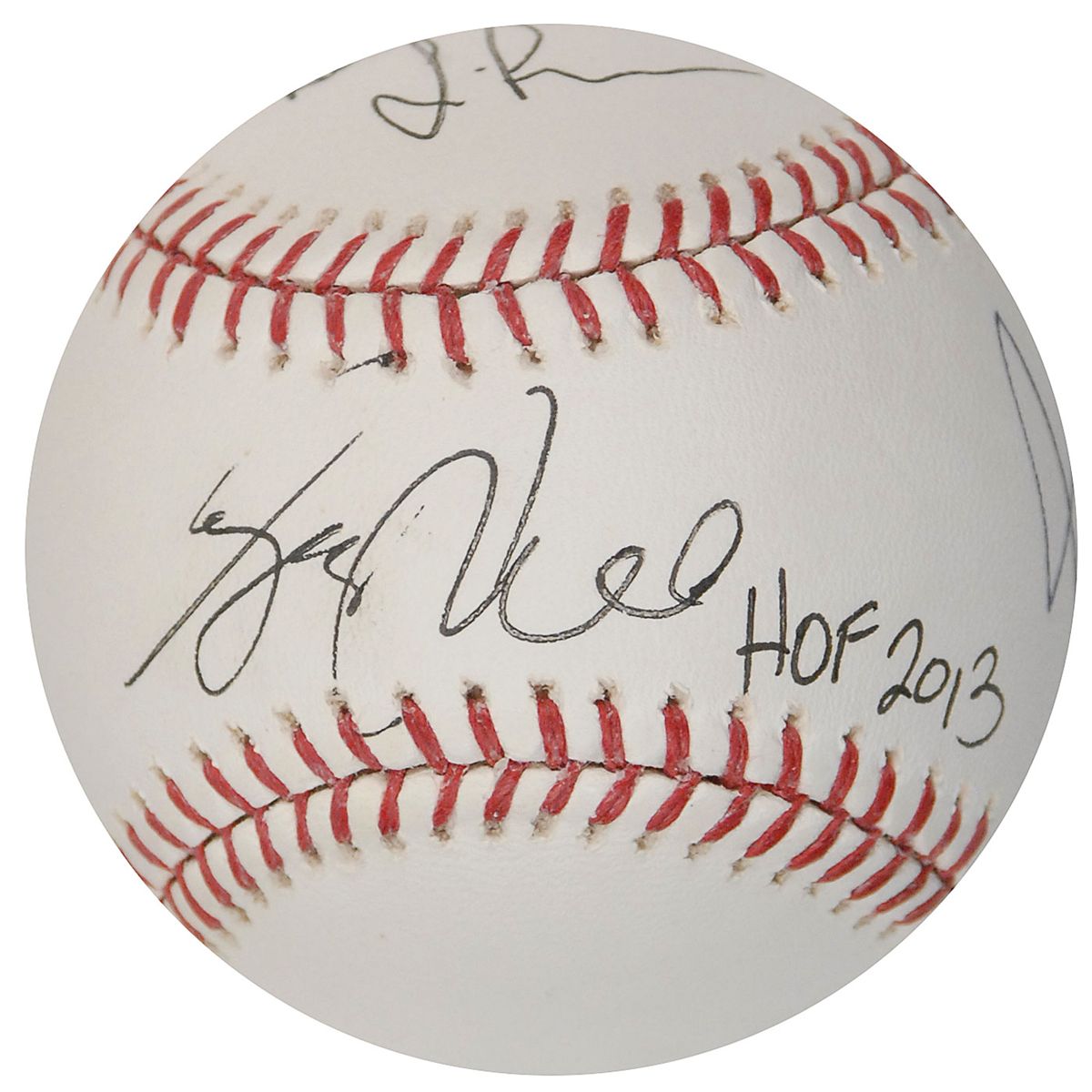 Official Rawlings Major League baseball signed in ballpoint on the sweet spot and side panels by Geddy Lee (ss), Alex Lifson, and Neil Peart, with Lee adding “HOF 2013.” In fine condition, with a PSA/DNA label affixed to the reverse (certificate of authenticity not present).