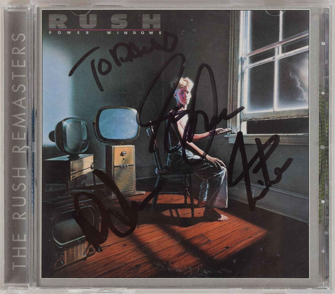 Power Windows CD signed on the front of the booklet in black felt tip by Geddy Lee, Alex Lifeson, and Neil Peart, with one adding an inscription, "To David." In fine condition. The CD is included.