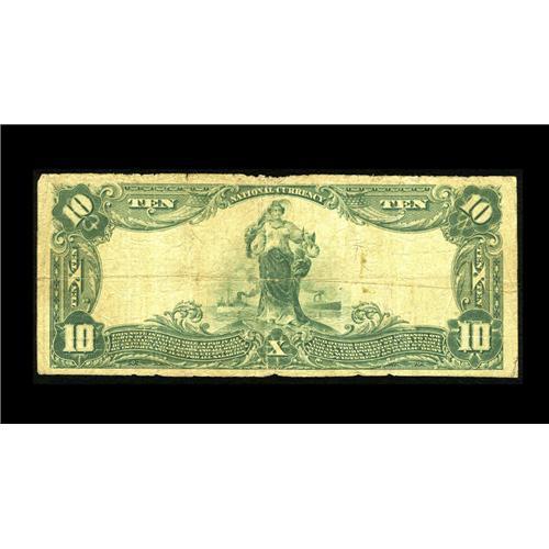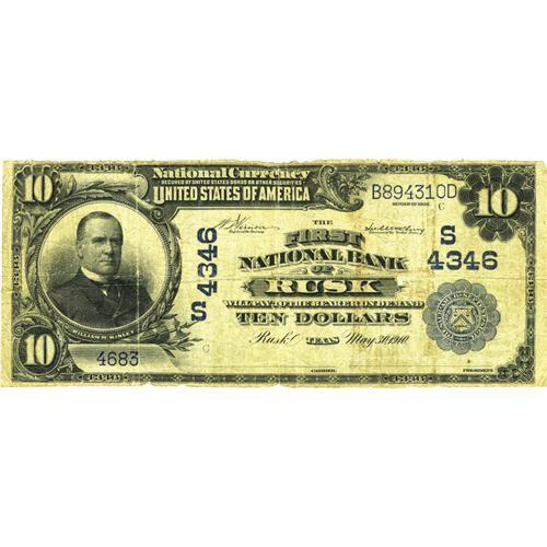 <B>Rusk, TX</B></I> - $10 1902 Plain Back Fr. 627 <B>The First NB</B></I> Ch. # (S)4346<BR>This is a truly rare note from the only bank to issue in this small community located in Cherokee County in deep east Texas. Six notes are listed in the census, a truly misleading figure if ever there was one, because four of those notes are likely permanently impounded in the Moody Foundation holdings. This town was missing from the Permian Basin and Ivy collections, and represented by only a single note in the Irish holdings. <B>Very Good-Fine,</B></I> with this note and the example offered above allowing two fortunate collectors to add a new town to his or her holdings.