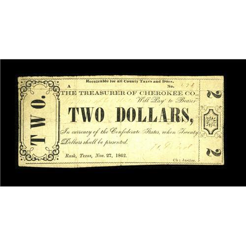 <B>Rusk, TX- Cherokee County</B></I> $2 Nov. 27, 1862 Medlar 3<BR>A very nice example from this very tough county. <B>Fine-Very Fine.</B></I><BR><I>From The William A. "Bill" Bond Collection</B></I><BR><BR><b>Shipping:</b> Coin/Currency (<a target="_blank" href="http://www.heritageauctions.com/common/shipping.php">view shipping information</a>)