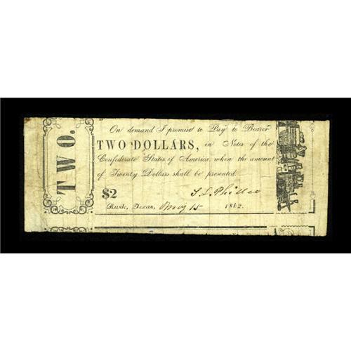 <B>Rusk, TX- T.L. Philleo</B></I> $2 May 15, 1862 Medlar UNL<BR>A very rare scrip issuer, with this denomination unlisted in Medlar. <B>Fine.</B></I><BR><I>From The William A. "Bill" Bond Collection</B></I><BR><BR><b>Shipping:</b> Coin/Currency (<a target="_blank" href="http://www.heritageauctions.com/common/shipping.php">view shipping information</a>)
