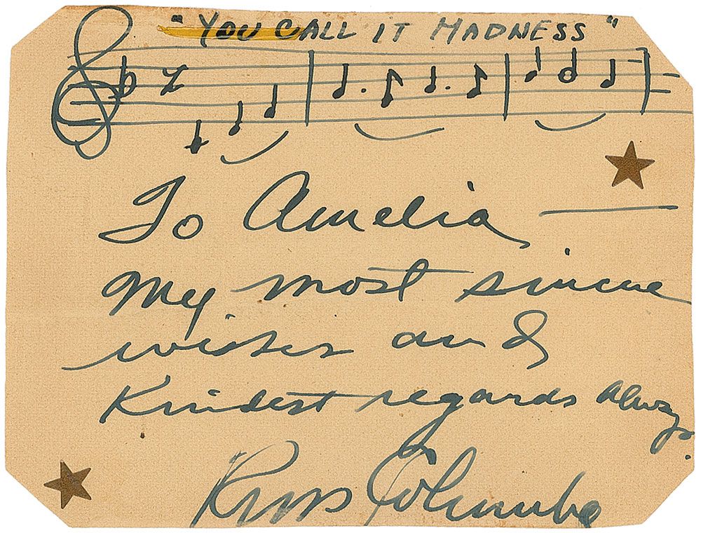Hollywood’s tragic crooner (1908–1934) who was killed in a peculiar incident when a friend accidentally set off a firearm, discharging a bullet that ricocheted off the table and hit Columbo in the forehead; at the time of his death, he was romantically involved with Carole Lombard. AMQS on an off-white 5.25 x 4 album page, signed and inscribed in fountain pen, “To Amelia—My most sincere wishes and kindest regards, always, Russ Columbo.” Columbo pens three bars of his song entitled “You Call It Madness.” In very good condition, with scattered creases, toned tape remnants to the top, and two affixed star stickers.