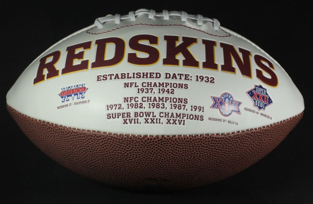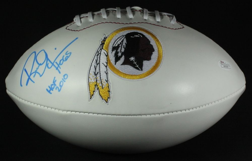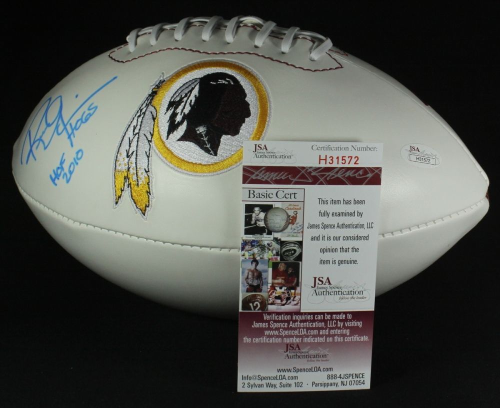 Full size Redskins logo football. Hand-signed in blue felt tip pen by Russ Grimm. Autograph includes an official James Spence Authentication (JSA) hologram and matching COA for authenticity purposes.