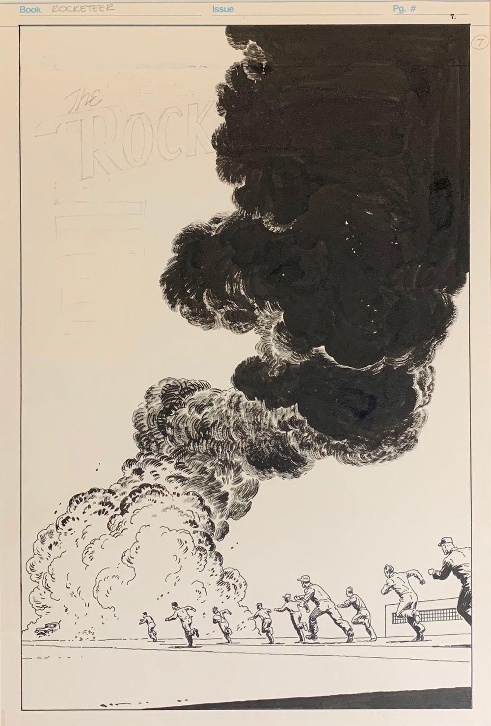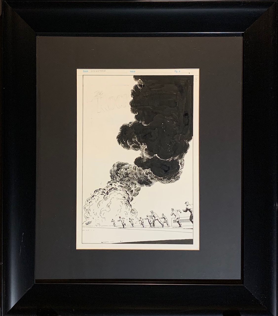 Russ Heath (1926 - 2018) Pencil and ink on board, 1991. "Rocketeer" Movie Adaptation spalsh page 7. Original outstanding page adaptation from the Dave Stevens' Rocketeer film. Page 7, as written in the top information line of the artwork. Board 15 x 10 in, framed 29.5 x 25.5 inches.