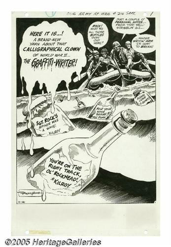 <B>Russ Heath - Our Army at War #210, Splash Page 1 Original Art (DC, 1969).</B></I> Here's a bit of a rarity -- a Russ Heath DC war full-page splash featuring Sgt. Rock and Easy Company. The DC war books developed a unique format where the yarns typically opened with a multi-paneled page one, followed by a double-page spread on pages two and three. There just aren't very many full page one splashes after late 1968. Sgt. Rock was joined in a raft by the Easy regulars, Little Sure Shot, Ice Cream Soldier, Bulldozer and Jackie Johnson. Rock is mocked by messages in bottles, all penned by that calligraphical clown, "the Graffiti-Writer." The image area is 10" x 13.25". There is a faint stain where the indicia has slipped off at the bottom of the page; otherwise the art is in Very Good condition.