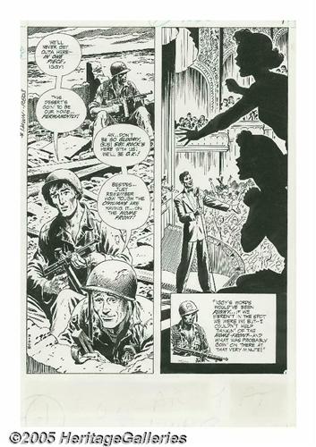 <B>Russ Heath - Our Army at War #225 Splash Page 1 Original Art (DC, 1970).</B></I> In this split-panel splash, Iggy and Gus of Easy Co. contrast their war-time hardships with the lifestyles of the civilians back at the home-front. Frank Sinatra cameos in panel two of this Russ Heath battle classic. Another highlight of the page is the somber portrait of Sgt. Rock on watch, with his built-in "combat antennae," in the first panel. The splash has an image area of 10" x 13.25". Aside from a mild stain outside the image area where the indicia has slipped off the page, the art is in Excellent condition. Nothin's ever easy for Easy!