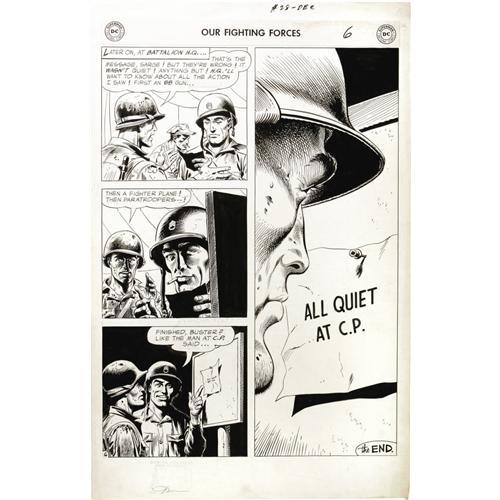 <B>Russ Heath - Our Fighting Forces #28, page 6 Original Art (DC, 1957).</B></I> It's hard to top the big, bold impact of "twice-up" art from the Golden and Silver Age DC war comics. The closing panels from "All Quiet at C. P." were expertly rendered by DC's topkick war artist, Russ Heath. This moody and dramatic four-panel page showcases his inking virtuosity at its finest. This superb piece has an image area of 13" x 18", and the art is in Excellent condition.<BR><BR><b>Shipping:</b> Flat Material, Large (<a target="_blank" href="http://www.heritageauctions.com/common/shipping.php">view shipping information</a>)