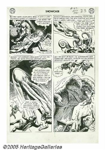 <B>Russ Heath - Showcase #27 Sea Devils page 18 Original Art (DC, 1960).</B></I> The original fantastic four, that quartet of young underwater adventurers dubbed the Sea Devils, defeat a giant octopus, only to be menaced by a gigantic hand in this sensational page from the yarn "The Golden Monster." Russ Heath's uncanny ability to draw reflected light into shadowed areas of his figures was ideally suited for drawing the effects of light underwater. Skin tight clothing on the beautiful Judy Walton also showcased Heath's talent for "good girl" art, and Judy had her teammates Dane Dorrance and Biff Bailey in an uproar. However, her brother Nick Walton was immune to her charms. The success of this first appearance of the team ensured they would soon get their own title. The image area of this page is 13" x 18", and the art is in Excellent condition.