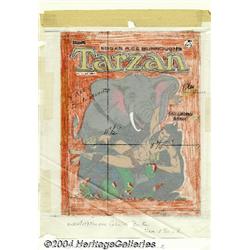 <B>Russ Manning - Tarzan Coloring Book Color Guide Cover (Saalfield, 1975).</B></I> A frolicsome Russ Manning Tarzan scene, showcasing the Lord of the Jungle enjoying a romp with two apes and a baby elephant, was used for the cover of a Saalfield coloring book, #C1864. The camera-ready art was created using an acetate overlay, with Manning's art photocopied onto the acetate, and then painted on the reverse with acrylic/vinyl paints, much in the manner of an animation cel. There is also a vellum overlay, colored orange with colored pencil, to indicate the background hue. The image area measures 8.75" x 11.5". The vellum overlay has some folds and creases; otherwise the art is in Very Good condition. A Good copy of the coloring book is included with this fun lot. <BR><BR><B>Important notice:</B> Heritage usually auctions material at the rate of 200-250 lots per hour. On some occasions eBay Live bid software or the Internet may not be able to keep up with the pace of the auction. We recommend placing a realistic absentee bid now as insurance to avoid disappointment. Occasionally the auctioneer may eliminate or reject an eBay Live bid, and the auctioneer may also reopen a lot after the close of the eBay live bidding (usually because we missed an audience bid), and may reject your bid even if it shows you as the winning bidder. By bidding via eBay Live, you agree that Heritage may award the lot to another bidder at its sole discretion under the circumstances described above or any other reasonable circumstances. Since eBay bids are not shown to us until we open the lot on the floor, we treat those bids just like floor bids. In most cases the floor responds before the eBay bid is presented to us, due to Internet lag time, so for consistency we have made it a policy that floor bids are always considered first over tie eBay live bids. Also please note that all Heritage lots purchased through eBay Live carry a 20% Buyer's Premium. Please make sure you read the Terms and Conditions before you bid.