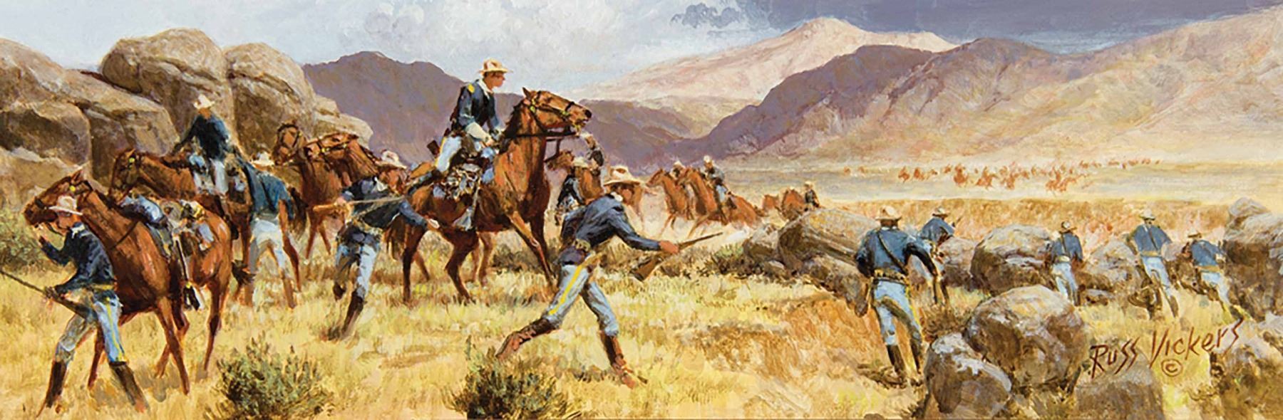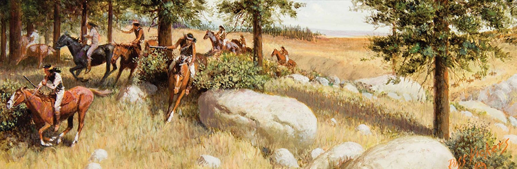 Artist: Russ Vickers Artist Lifespan: 1923-1997. Signed lower right. Verso: Signed and titled. Dimensions: 4 x 12 inches each. Shipping: 8x16 (4). Oil on board