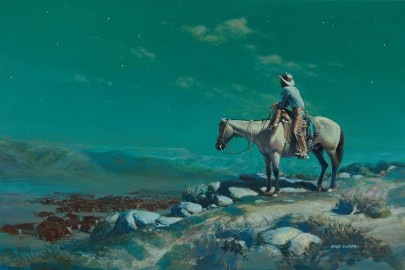 To the unaided eye, this piece appears to be in very good condition. Inspection under ultraviolet light reveal signs of potential in painting on the face of the rider and on the face of the horse. The piece is framed in a textured, dark antiqued green frame with a linen liner and a silver fillet. The frame is in good condition with normal signs of wear. The liner shows some discoloration. Verso: [handwritten on back of canvas] Night Herder -66'