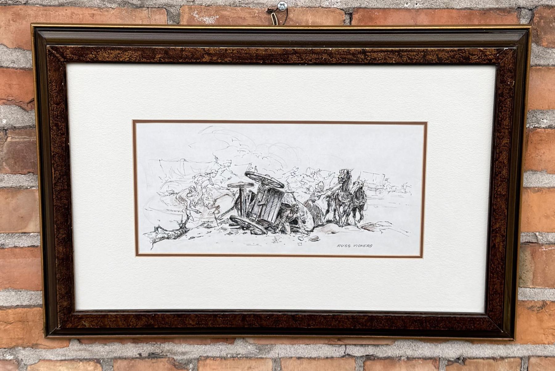 Title is Roll for the Homestead. 7" by 14" unframed. 15 3/4" by 23 1/2" framed. Russ Vickers (1923 - 1997) was active/lived in California, Arizona. Russ Vickers is known for Indian-western genre-views, illustrator. Russ Vickers was noted as the artist for paintings shown at the beginning and ending credits of the movie, CHISUM, starring John Wayne. Russ Vickers was a painter in realist or traditional style of western scenes, beginning with the Civil War and moving forward. He was born in Paris, Texas, and his father was a horse trader. He served in the Marines in World War II and as a combat artist in Korea. He had little formal schooling and spent about twenty years as a technical illustrator for the aerospace industry in Los Angeles, painting western genre in his spare time. In 1970, he took the correspondence course from the Famous Artists School and began showing his paintings in Sedona. From 1973, he lived in Tempe, Arizona and dedicated himself to full-time painting.