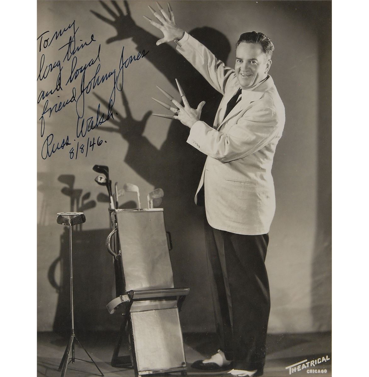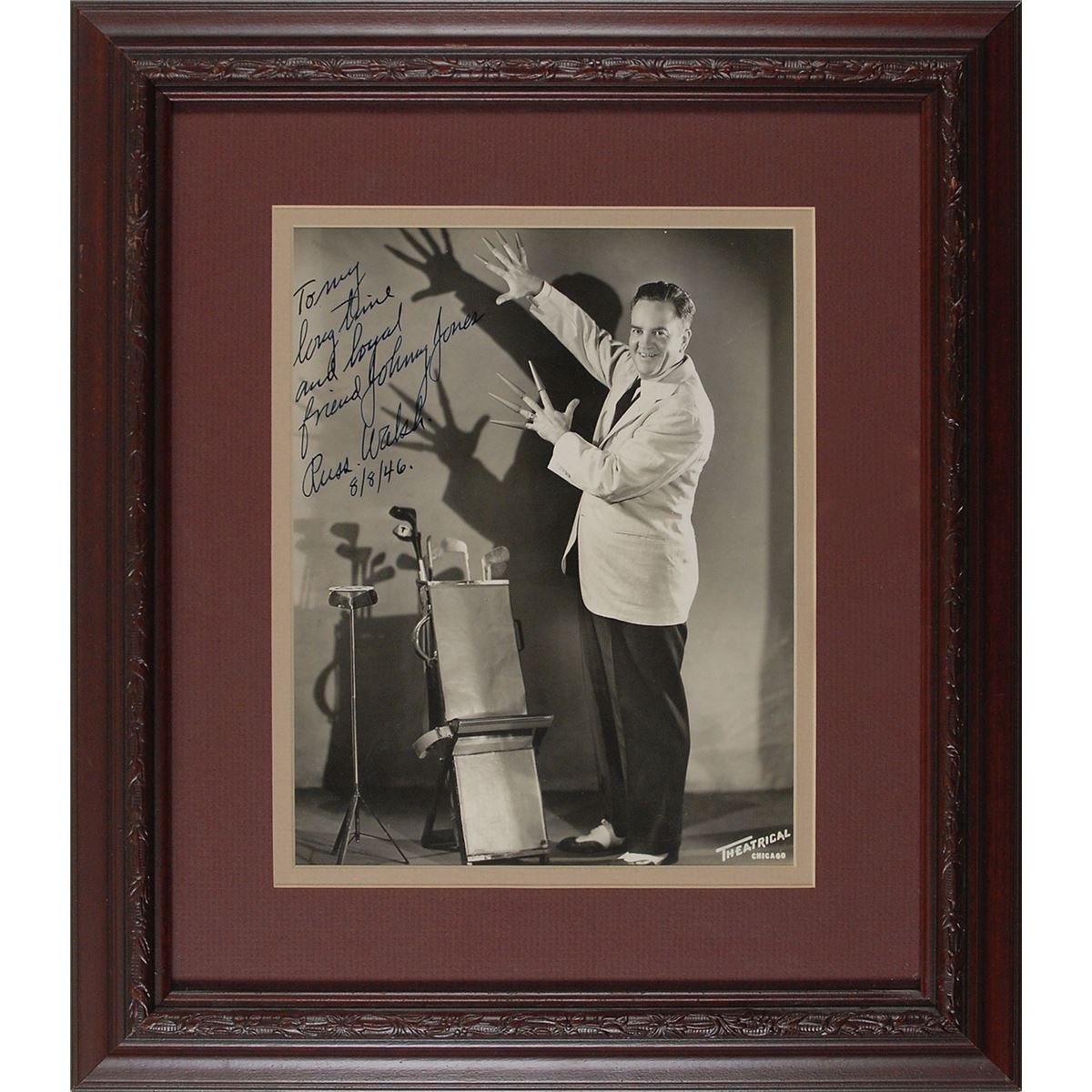 William Russell Walsh (1894–1971) was an amateur magician who served as president of the Society of American Magicians and the International Brotherhood of Magicians. Uncommon vintage glossy 7 x 9 image of Walsh performing a shadow trick near some golf props, boldly signed and inscribed in fountain pen, “To my long time and loyal friend Johnny Jones, Russ. Walsh. 8/8/46.” Double-matted and framed to an overall size of 13.5 x 15.5. In fine condition. The James Collings Collection.