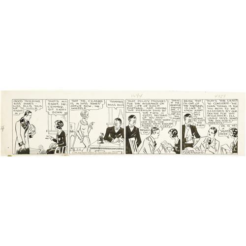 Tillie Jones and Mr. Whipple get a sales pitch from the slick life insurance salesman, Mr. Whipple, in this stylish daily from the thirties. The image area of this daily is 19.5" x 4.75", and the art is in Excellent condition.<BR><BR><b>Shipping:</b> Large Flat (<a target="_blank" href="http://www.heritageauctions.com/common/shipping.php">view shipping information</a>)
