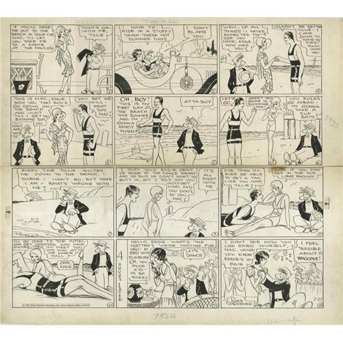 <B>Russ Westover - Tillie the Toiler Sunday Comic Strip Original Art, dated 7-27-30 (King Features Syndicate, 1930).</B></I> Tillie and Mac's day at the beach is spoiled by Tillie's handsome friend, Eddie, who manages to invite himself to spend the day with them. But they spend their evening alone because it turns out that "too-persistent" Eddie got too much sun. This sunny Sunday by Russ Westover has an image area of 18.5" x 17". The art was cut between panel tiers two and three, and then carefully rejoined. There is a bit of aging apparent along the conjoined line, and a couple of small stains in the ninth panel, otherwise this work is in Very Good condition.