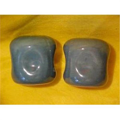 Lovely dark blue/green color on this 2 inch shakers by Russel Wright, American Modern, Steubenville. Very, very light crazing with no chips or scratches, cork stoppers.