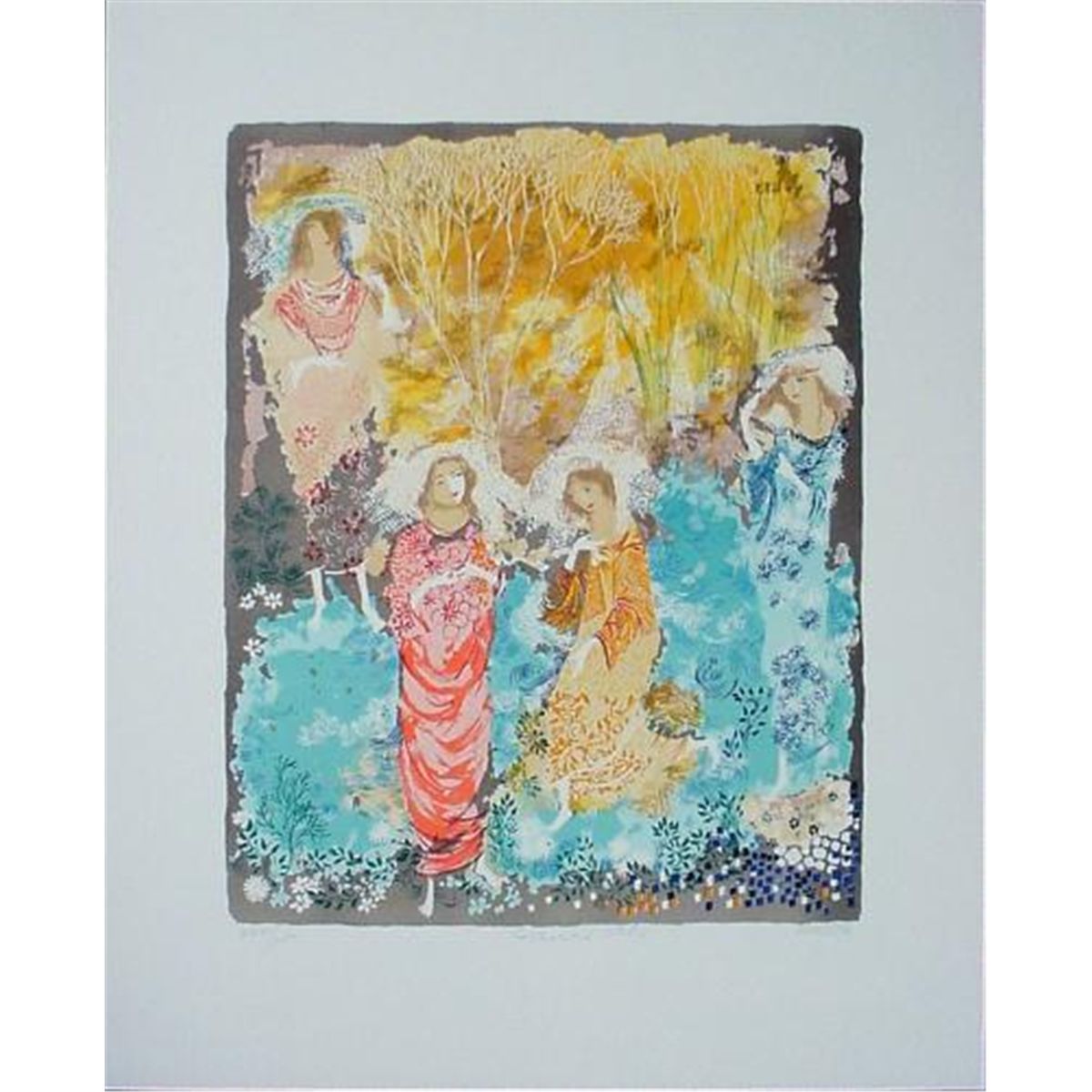 This enchanting print of a fairy-tale like scene is by well-known artist Gertrude Russell-Barrer (USA, 1921 - 1992): * Title: "Enchanted Lake" * Lithography on Arches like paper * Artist's signature in pencil in the margin LR * Numbered in pencil in the margin LL * Atelier Dumas blindstamp LL * Sheet size: 21 × 26 * Very good condition; bright and fresh * Midwest Estate Buyers Certificate of Authenticity * * The work of Gertrude Russell-Barrer, well-known and listed illustrator, muralist, painter, printmaker and ceramicist studied at the Art Students League NY. Her work has been shown at The Art Institute of Chicago, the Brooklyn Museum, the Pennsylvania Academy and the Whitney Museum. * * A wonderful image, priced to sell!