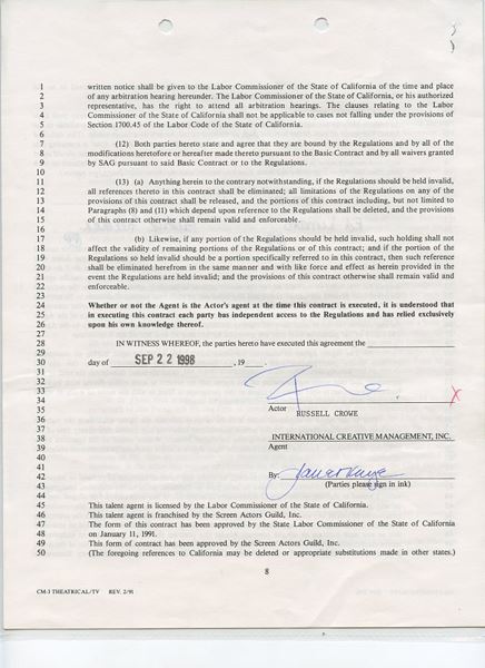 You are bidding on a contract signed by Russell Crowe. This item comes with a Certificate of Authenticity guaranteed for the life of the piece.