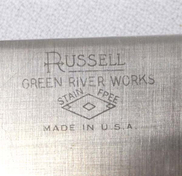 Russell Green River Butcher Knife, measures 2'' x 13'', wood handled