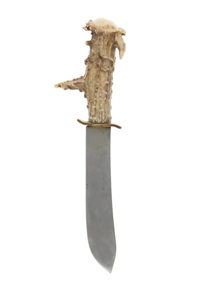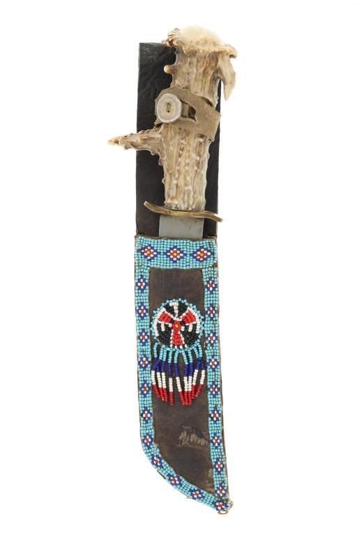 Featured in this lot is this Russell Green River Works knife with a beautiful beaded leather sheath and antler handle. This knife is manufactured by J. Russell & Co. from Green River Works and is a knife that would typically be traded to the Northern Plains Indians in the 19th Century. The knife shows the "Russell Green River Works" hallmark parallel with the hilt. John Russell founded his namesake cutlery circa early 1830's and by 1836 he moved the factory location to the Green River Massachusetts area. A fire delayed the factories success, but by circa 1840 with the help of Henry Clapp the factory was rebuilt and christened the "Green River Works" with all knives produced here hallmarked, "J. Russell & Co. Green River Works." The knife shows a unique clip point knife design with brass like hilt, and a Stag Antler grip. The sheath is constructed of leather and shows beautiful trade seed beadwork in colors of black, white, red, yellow, teal and blue. When the knife is secured in the sheath, a hide strap can be button around the handle to keep the knife from slipping out. The knife and sheath show good condition overall with the sheath exhibiting more wear than the knife from its age and use over the years. No signs of obvious damage is noted. The knife measures 11 15/16" L x 3 3/8" W. The sheath measures 12 7/16" L x 2 1/4" W. They have a collective weight of 12 ounces.