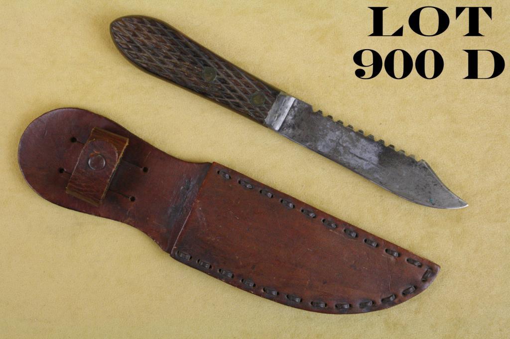 Russell Green River Works knife with later leather sheath, approx. 9” overall with an approx. 4-1/2” blade in overall good condition showing some sharpening and scattered light erosion and toning; checkered wood grips with two brass attaching rivets; sheath is unmarked and in overall good condition and later than the knife’s manufacture. Est.: $100-$200.