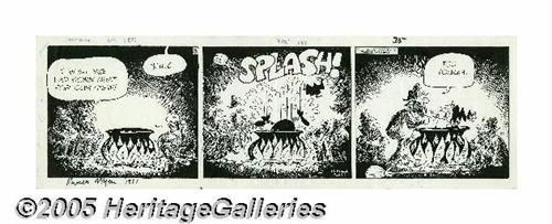 <B>Russell Myers - Broom-Hilda Daily Comic Strip Original Art, dated 12-7-70 (Chicago Tribune, 1970).</B></I> Despite her comical repulsive appearance, crass self-indulgence, and habitual irritability, Broom-Hilda is an endearing character who clearly casts an enchanting spell on her millions of faithful readers. She's got tough skin, too! This daily has an image area of 21" x 6" and is in Excellent condition. Signed by Russell Myers at the bottom left.