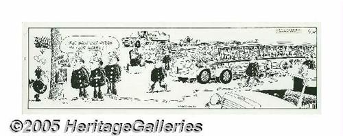 <B>Russell Myers - Broom Hilda Daily Comic Strip Original Art, dated 6-24-71 (Chicago Tribune, 1971).</B></I> A great single-panel gag from this long-running strip. Broom Hilda is head-over-heels in love, and calls out the FD to quench the fires of her passion. Myers' expressive linework fills the frame with eye-pleasing details. The image area measures 21" x 6" and the art is in Excellent condition.