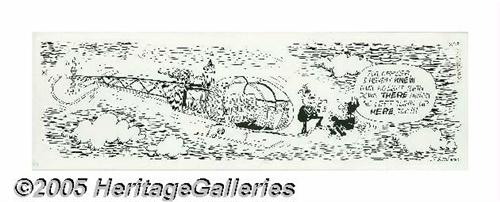 <B>Russell Myers - Broom Hilda Daily Comic Strip Original Art, dated 7-23-71 (Chicago Tribune, 1971).</B></I> Ignorance of the law is no excuse, as Broom Hilda finds out in this hysterical daily, which also features a very nifty drawing of a helicopter! BH had only been running a little over a year at this point, but her immortality was already assured. A splendid example of this beloved strip. The image area measures 21" x 6" and the art is in Excellent condition.