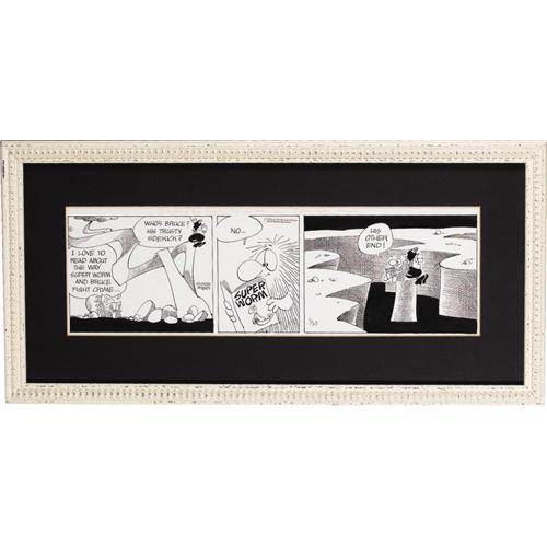 <B>Russell Myers - Broom Hilda Daily Comic Strip Original Art, dated 1-23-73 (Chicago Tribune, 1973).</B></I> Broom-Hilda and Irwin Troll make ends meet in this enchanting daily by Russell Myers. The love-starved witch has entranced newspaper fans with her hilarious musings about life since 1970. The image area measures 21" x 6", and the art is matted and framed and in Excellent condition. Signed and inscribed by Russell Myers at the top (some fading is apparent). <I>From the Estate of Bruce Hamilton</B></I>. <BR><BR><b>Shipping:</b> Comics - Slabbed (certified) (<a target="_blank" href="http://www.heritageauctions.com/common/shipping.php">view shipping information</a>)