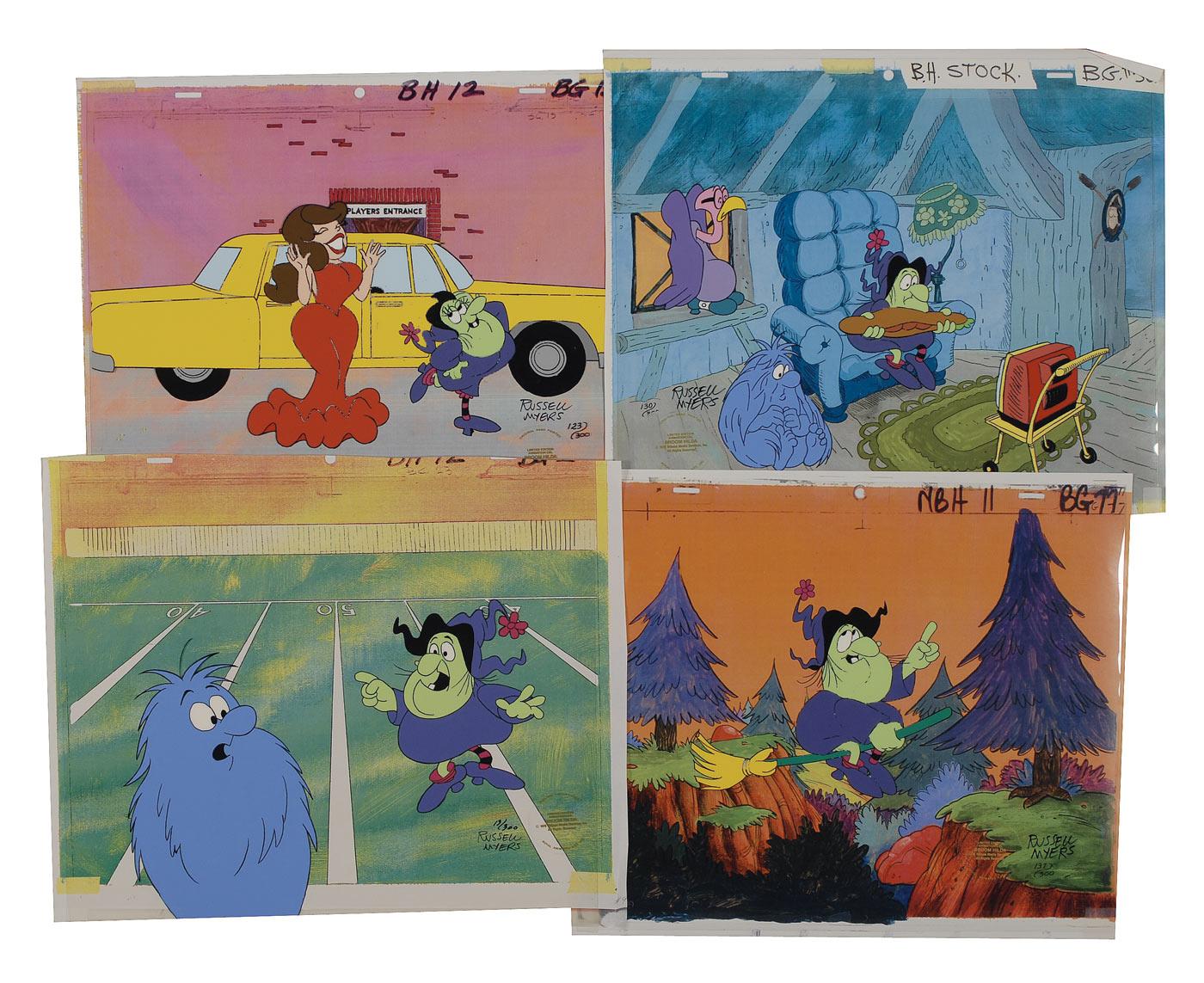 Four hand-painted color animation cels of Broom Hilda, each approximately 13.5 x 11, each set against its original painted background. Each cel is signed in black felt tip by Russell Myers, individually numbered in a run of 300 pieces, and bear an adhesive sticker identifying it as a limited edition from 1978. In overall fine condition.