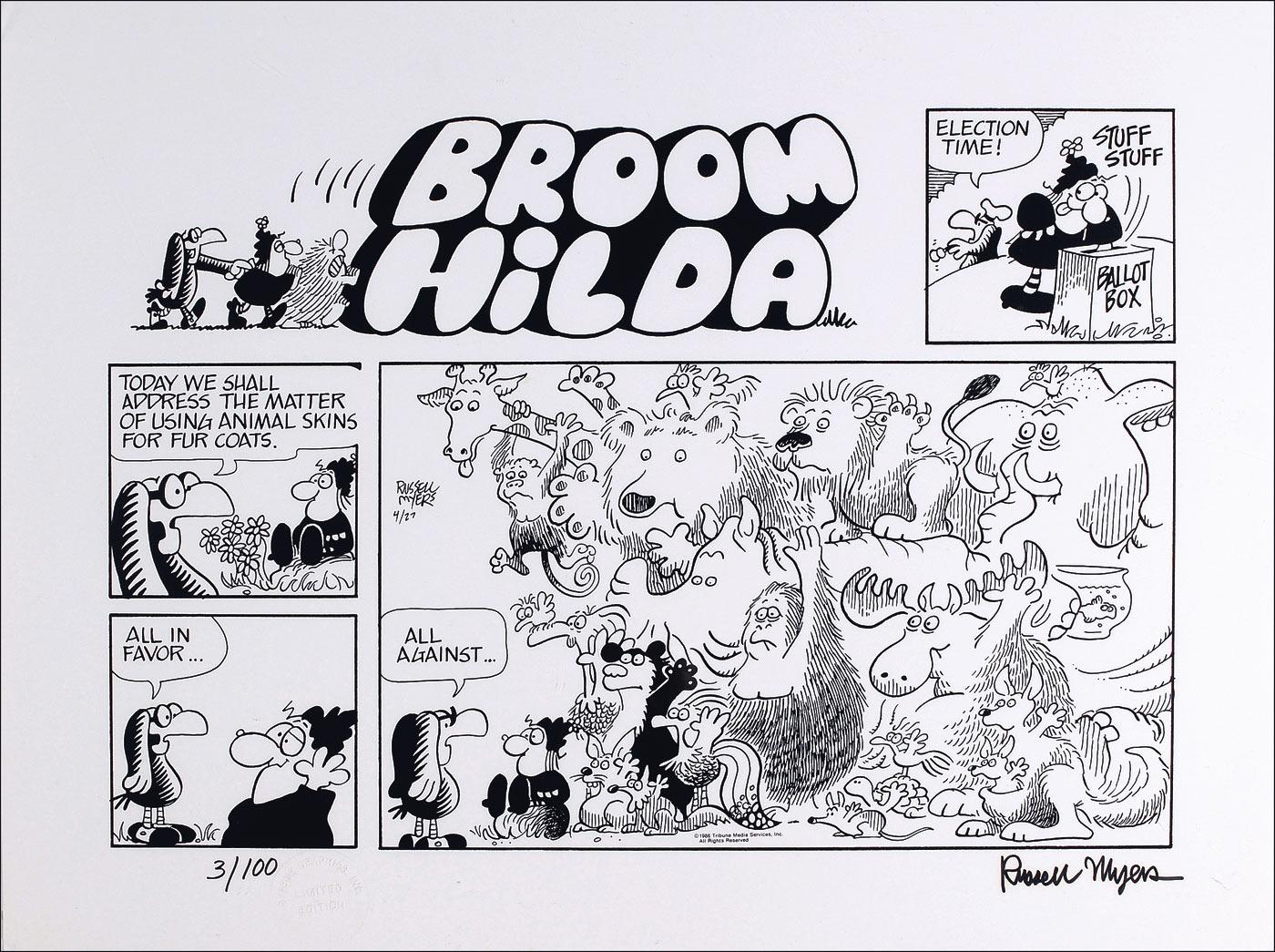Limited edition 24 x 18 print of a Broom Hilda Sunday comic strip, numbered #3/100, signed in black felt tip, “Russell Myers.” In fine condition, with a few corner creases and very faint haloing to the signature.
