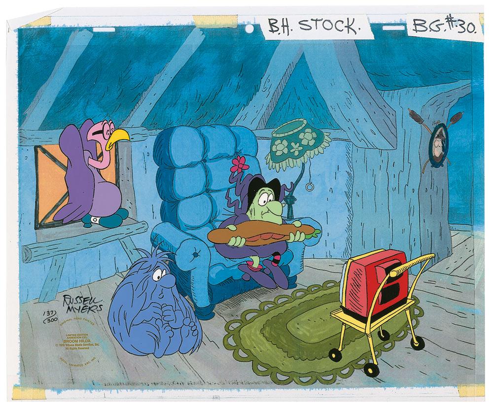 Hand-painted color animation cel of Broom Hilda, 12.5 x 10 and set against its original painted background. Signed in black felt tip by Russell Myers, individually numbered in a run of 300 pieces, this #137/300, with an adhesive sticker identifying it as a limited edition from 1978. In fine condition.