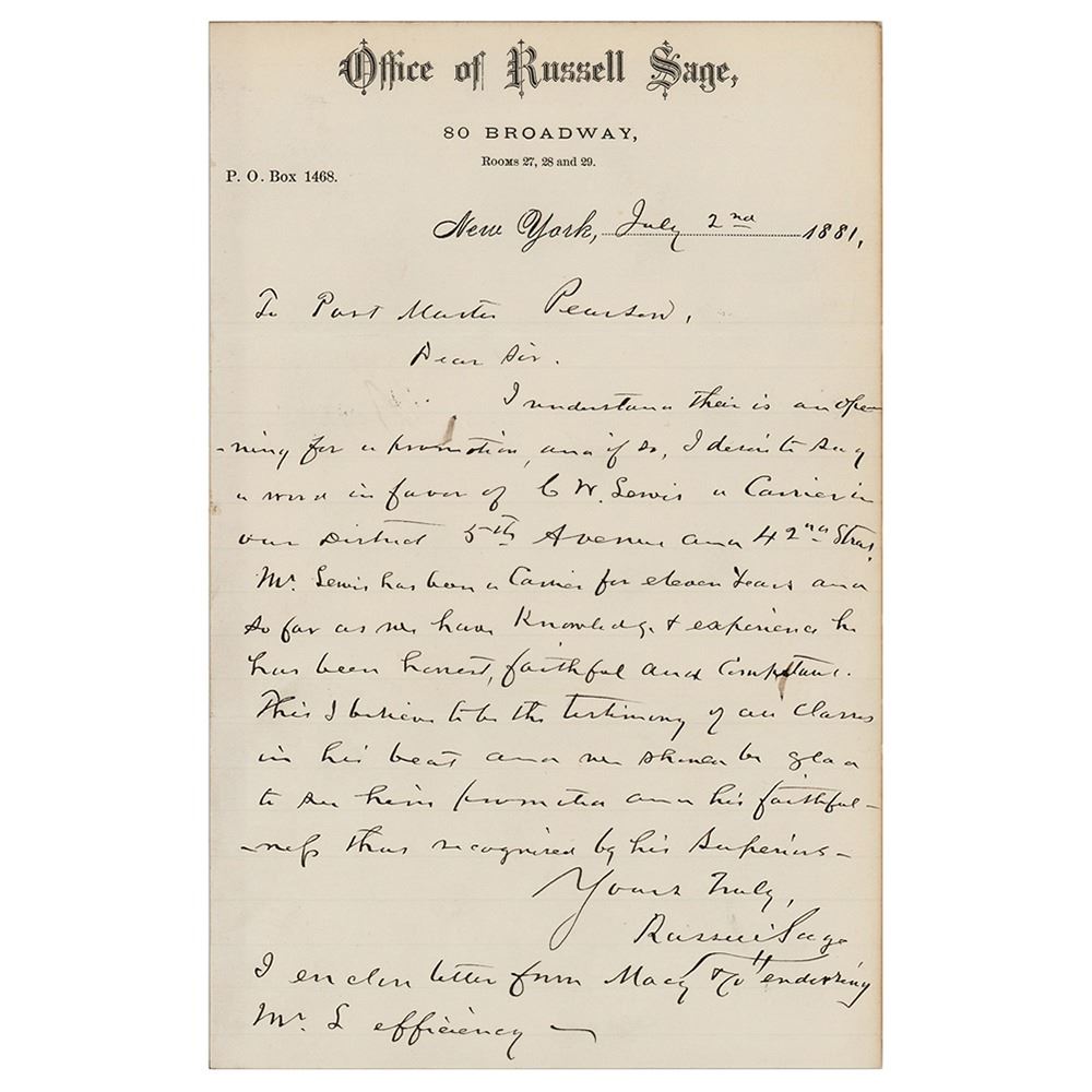 ALS, one page, 5 x 7.75, personal letterhead, July 2, 1881. Handwritten letter to "Postmaster Pearson," in part: "I understand there is an opening for a promotion, and if so, I desire to say a word in favor of C. W. Lewis…Mr. Lewis has been a carrier for eleven years and so far as we have knowledge, & experience he has been honest, faithful and competent." In fine condition.
