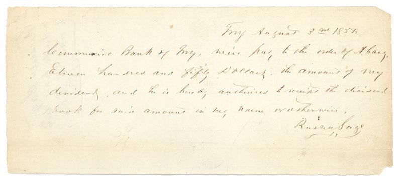 Russell Sage (1816-1906) Banker; Financier; U.S. Congressman. As the originator of “put and all options”, Sage greatly changed the way speculators played the stock market. Among America’s most powerful and wealthy bankers, he finance Jay Gould and made a vast fortune on the latter’s stock manipulations. “Sage was on of the shrewdest and most conservative of all great financiers.” (DAB) At one time he is said to have had $27,000,000 out on call loans. At the time of his death he left a fortune worth an estimated $70,000,000. DS 1 page. Troy, August 3, 1854. “Commercial Bank of Troy will pay to the order of A. Cary eleven hundred and fifty dollars, the amount of my dividend and he is hereby authorized to receipt the dividend book for said amount in my name or otherwise. Russell Sage.” Fine