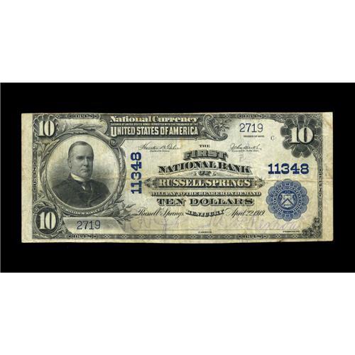<B>Russell Springs, KY</B></I> - $10 1902 Plain Back Fr. 632 <B>The First NB</B></I> Ch. # 11348<BR>This state certainly likes its Russells, as notes exist from Russell, Russellville, and Russell Springs. Not many, however, in this case, as the total large size census from here is all of two, with the whereabouts of the second specimen unknown. Even Glenn Martin was never able to find any large note from this community, which was founded as a health resort based on its curative springs. <B>Fine-Very Fine,</B></I> a great item worth every dollar it costs to bring it home tonight.