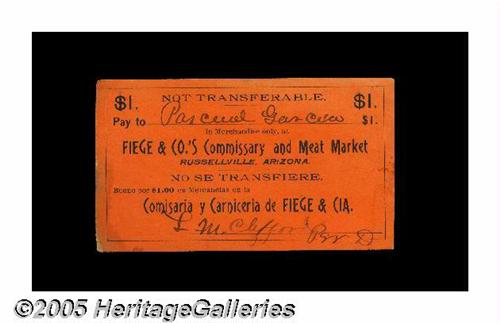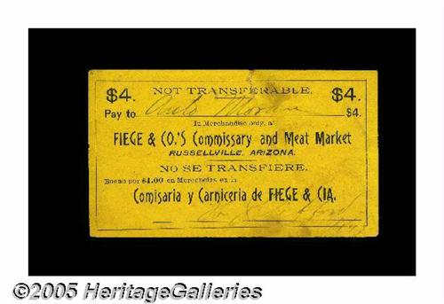 <B>Russellville, AZ- Fiege & Co.</B></I> $1, $4<BR>Two bilingual cardboard chits from a community which is now a ghost town according to the Birt Arizona reference which lists both of these denominations. Both are <B>New,</B></I> but the $4 has a tear at the top and bears a "Paid" stamp dated April 14, 1900 on the back, with the $1 stamped "Paid" on Feb. 5, 1908.