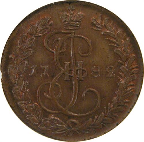 1/2 Kopek 1782 NGC MS-66. This is a very well struck piece with strongly lustrous and near flawless surfaces that have traces of original red. It is probably a novodel, though this is not mentioned on the certificate. Mentioned on the certificate is “Hesselgesser”