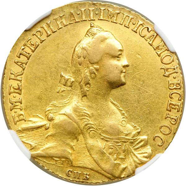 Russia. 10 Roubles, 1766/5-. Bitkin-1st Ed-Unlisted variety; Fr-129a; KM-C79a. Catherine II, The Great, 1762-1796. Variety with mint mark, lower under bust. Obverse legend ends higher. Bust right. Reverse: Cross of four shields. NGC graded EF-40.