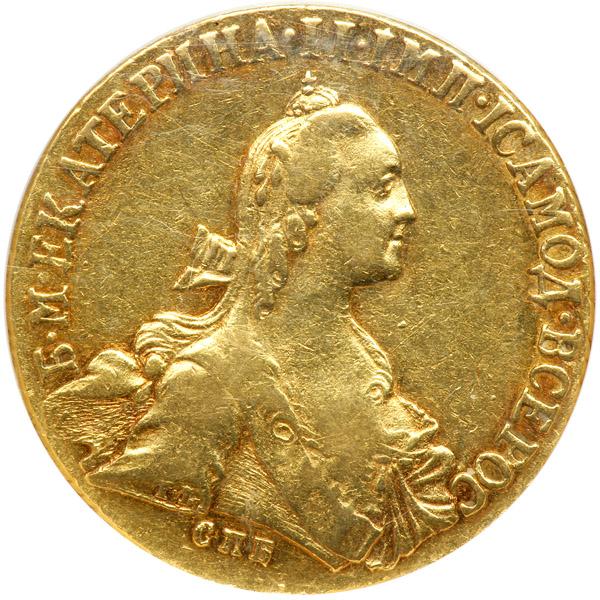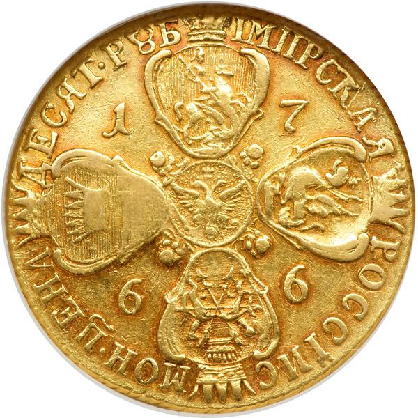 Russia. 10 Roubles, 1766-. Bitkin 1st ed-10; Fr-129a; KM-C79a. Catherine II, The Great, 1762-1796. Bust right. Mint mark, higher under bust. Reverse: Cross of four shields. NGC graded VF-35.