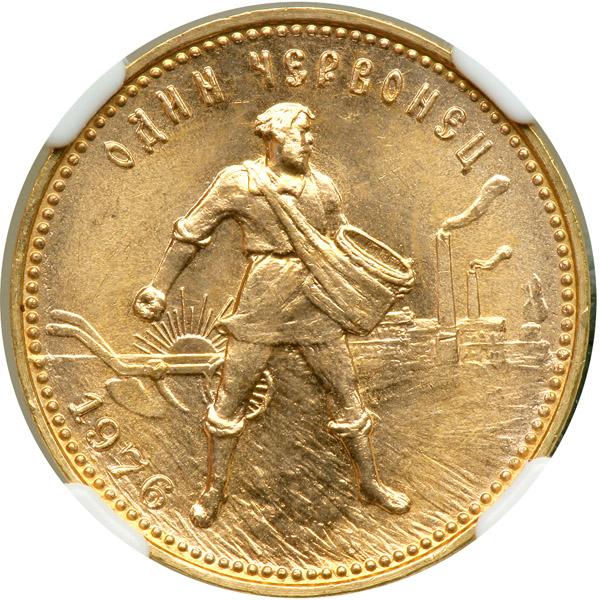 Russia. 10 Roubles or 1 Chervonetz, 1976. Fr-181a; KM-Y85. Weight 0.2489 ounce. Sower scattering seed. Reverse: Hammer and sickle. NGC graded MS-66.