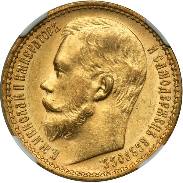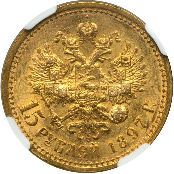 Russia. 15 Rubles, 1897-АГ. Bitkin 1st ed-2; Fr-177; KM-Y65. Narrow rim variety. Nicholas II. One year type. NGC graded MS-61.