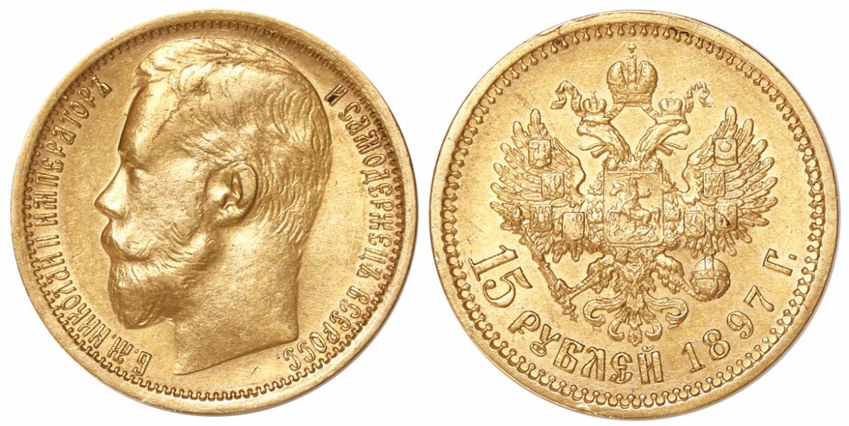 Russia, 15 roubles, Nicholas II, 1897, moneyer's initials on edge, wide rim.