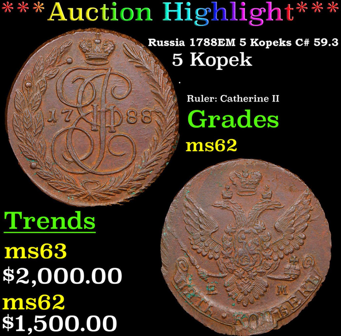 Russia 1788?? 5 Kopeks C# 59.3 Grades Select Unc. About the Kopek, 100 Kopeks make 1 Ruble. To give an idea of the purchasing power of one of these in the 1790's one could purchase 50 apples for a Kopek, so these kopek pieces did have some nice buying power.The mintmarks available on these coins are:AM AnnenskEM EkaterinburgKM KolyvanMM MoscowCM Sestroretsk, Finland??? St. PetersburgTM Feodesia, CrimeaIn addition there a few years that pieces with no mint mark can be found. A Key Date's Pick, Bid to Win, Don't let it get Away Coin